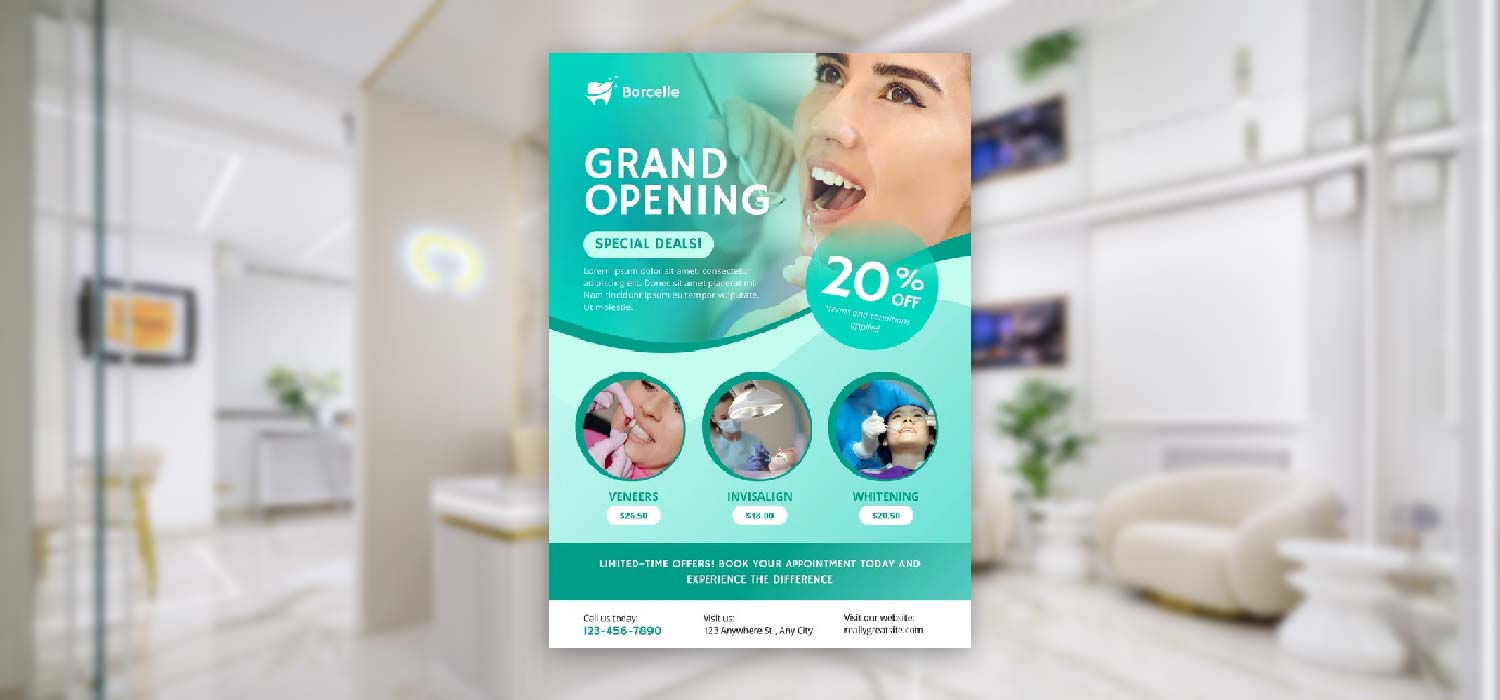 - تخفیف ویژه یا جشنوارهها: مثلاً «سفید کردن دندان با ۳۰٪ تخفیف تا آخر این ماه» یا «ویزیت رایگان برای اولین مراجعه».
